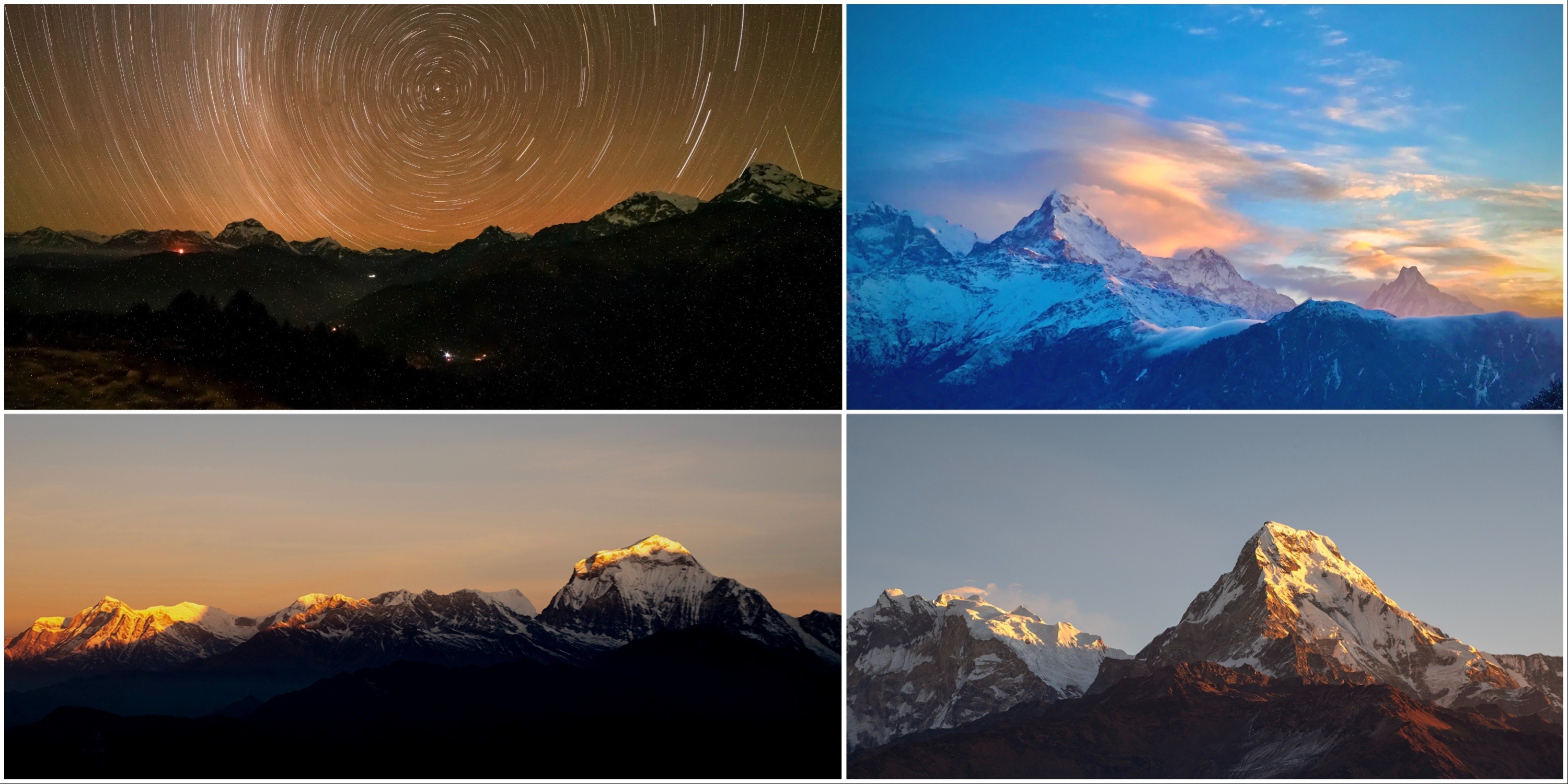 Right after, the first rays catch Dhaulagiri, and it practically ignites. Machapuchare, with its sharp fishtail, glows gold too. It’s surreal—over 20 peaks suddenly bathed in color. You can’t help but snap photo after photo, trying to hold onto it before it fades.