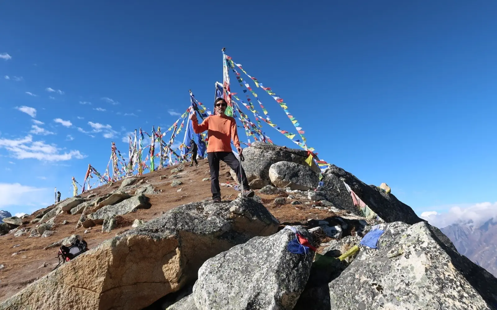 Meanwhile, reach the mid-ridge viewpoint at about 4,300 meters. The views of Langtang Lirung at 7,227m increase tremendously. Hydration remains essential here as well.