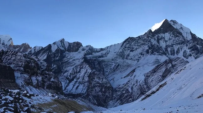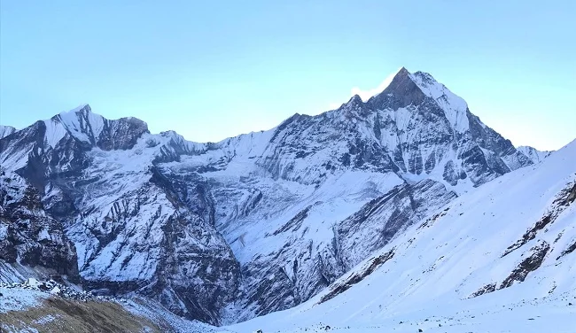 Before arriving at ABC, trekkers stop at Machhapuchhre Base Camp (3,700m), where they can enjoy spectacular views of Machhapuchhre, often referred to as the "Fishtail Mountain."