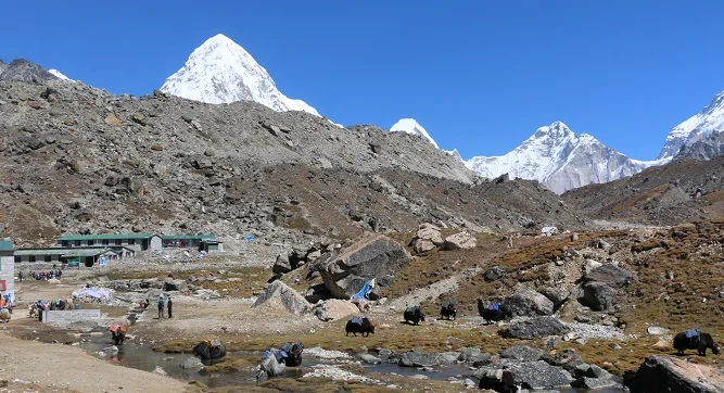 It was on the last settlement before the Everest Base Camp Hiking route, the trekkers reach the place called Gorakshep (5,164m), and from there, they have the tiring hike to Kala Patthar at 5,545m for excellent sunrise views of Everest; finally, to the very Everest base camp at 5,364m, it stands surrounded by glaciers and seracs.