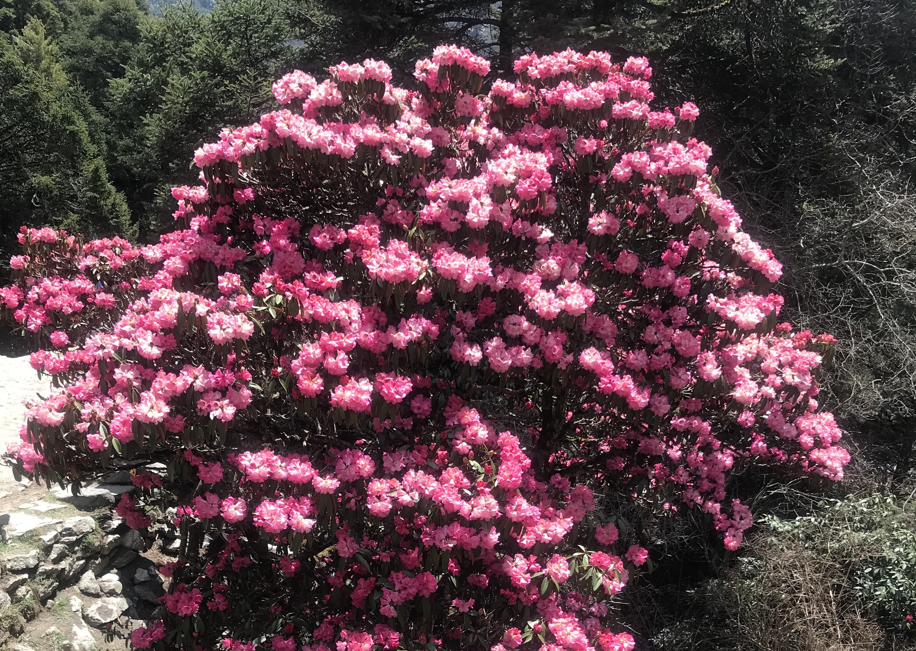 Meanwhile, trekkers leave Banthanti behind at 2,250 meters, stepping straight into forests that feel alive with color. The trail climbs, winding through mist and bursts of spring blooms. Rhododendrons steal the show—red, pink, and white flowers crowd together overhead, turning the path into a living rainbow. The air’s thick with their scent, and you can’t help but breathe it in.