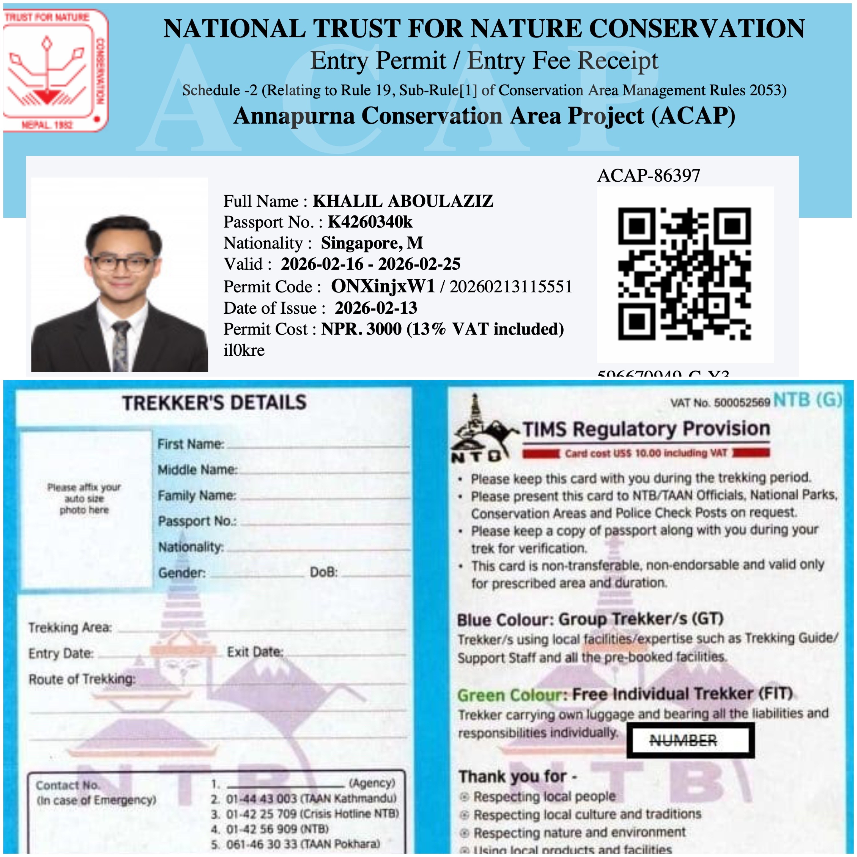 | ACAP | NPR 3,000 (~USD 25) NPR 1,000 (~USD 8) | NTB Kathmandu/Pokhara or online | Mandatory for entry, single entry, funds conservation. |