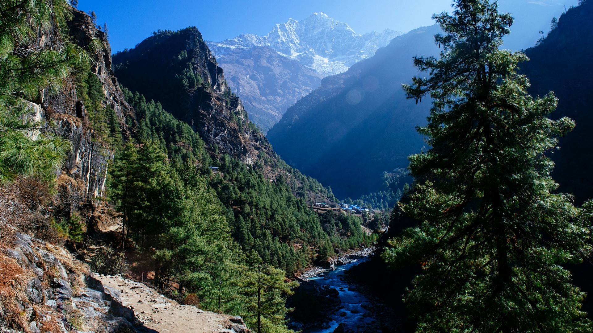Moreover, forests line the edges of the first glimpses of the mountains, setting the scene naturally. The pines split apart, showing the snow-covered peaks shining brightly. Thamserku, standing at 6,608 meters, stands out strongly on the eastern horizon. Kusum Kangaru, standing at 6,367 meters, stands out with its three dramatic peaks.