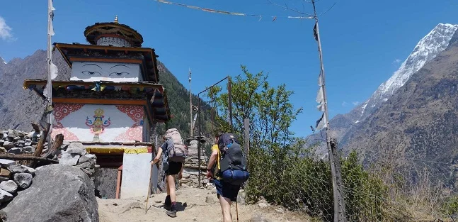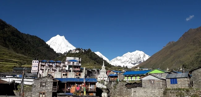 The trek passes through culturally rich villages like Namrung (2,630m), Lho, and Samagaun, where trekkers can visit ancient monasteries like Ribung Gompa in Lho and Pungyen Gompa near Samagaun. These villages are indicative of heavy Tibetan influences in prayer wheels, mani walls, and painted chortens.