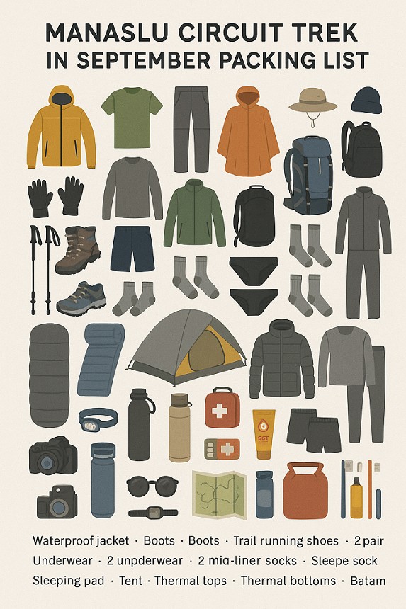Take waterproof gear and quick-drying clothing for Manaslu Circuit in September. Take altitude meds, snacks, and a water purifier. Always bring a good headlamp and trekking poles.