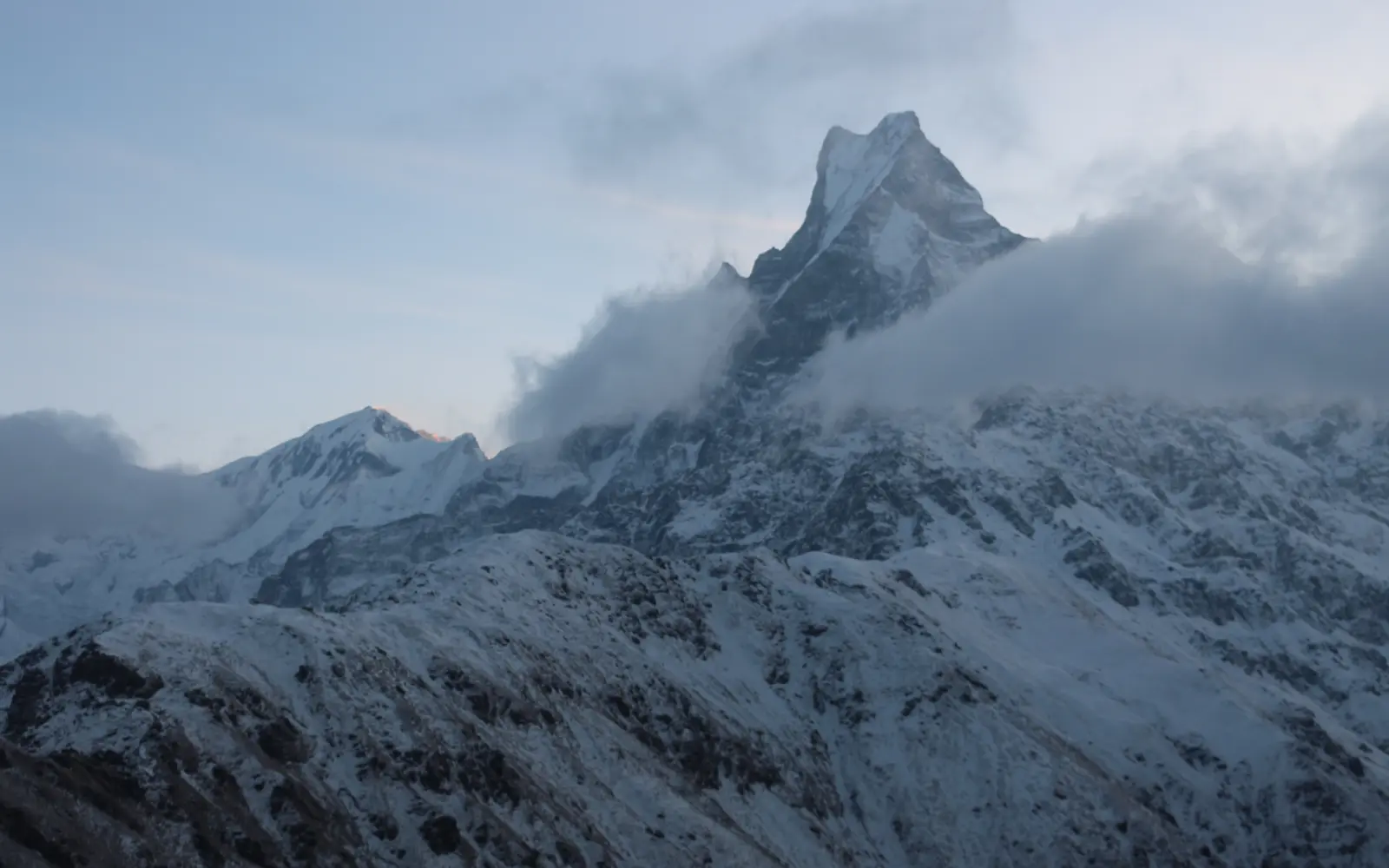 In fact, the real magic is in the mornings. Skies usually stay bright and clear until lunchtime — the kind of blue that makes the mammoth line-up of Mardi Himal (5,587 meters), Machhapuchhre (6,993 meters), Annapurna I (8,091 meters), and Annapurna South (7,219 meters) look impossibly close. Base Camp (4,500 meters) is a front-row seat to the spectacle. Clouds do build up most afternoons, and sometimes the air takes on a soft haze, but rain is rare in May. The trails stay dry and easy to manage.